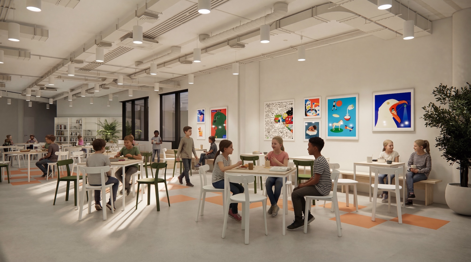 - Komfort pro rodiče i děti: Vlastní jídelna s ohledem na diety , šatny a unikátní coworkingová zóna přímo pro rodiče.